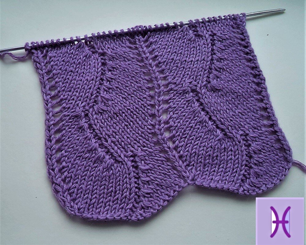 Предлагаю для всех любителей вязания на спицах парочку красивых узоров. Узоры интересны тем, что нижний край получается волнистым. Узоры прекрасно подойдут для вязания платьев, кардиганов, юбок, шарфиков. Ажурный вертикальный узор Узор с крупным раппортом. Великолепно будет смотреться в кардиганах, юбках. Описание вязания узора. Раппорт узора равен 18 петлям по ширине и 24 рядам по высоте вязаного полотна. Количество петель в наборе должно быть кратно 18 плюс 1 петля для симметрии плюс 2 кромочные петли. 1-й ряд: кромочная,* 1 лицевая, накид, 7 лицевых, 3 вместе лицевой за задние стенки, 1 изнаночная, 6 лицевых, накид, * 1 лицевая, кромочная 2-й ряд и все четные ряды: вяжутся по рисунку вязки 3-й ряд: кромочная,* 1 лицевая, накид, 6 лицевых, 3 вместе лицевой за задние стенки, 1 изнаночная, 7 лицевых, накид, * 1 лицевая, кромочная 5-й ряд: кромочная,* 1 лицевая, накид, 5 лицевых, 3 вместе лицевой за задние стенки, 1 изнаночная, 8 лицевых, накид, * 1 лицевая, кромочная 7-й ряд: кромочная