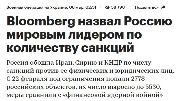 Мировое информационное агентство Bloomberg, ссылаясь на базу данных платформы Castellum.AI, сообщает, что Россия стала абсолютным лидером по количеству введенных против нее санкций, существенно обогнав Иран, который ранее лидировал в этом рейтинге. До 22 февраля 2022 года под санкциями находились 2754 российских объекта, а после их количество увеличилось еще на 2778 объектов. На текущий момент общее количество подсанкционных объектов (юридических и физических лиц) в России превышает 5530. Для сравнения, в Иране, который до этого лидировал в мировом санкционном рейтинге, ограничения наложены на 3616 объектов. Далее следуют Сирия (2608 объектов), КНДР (2077), Венесуэла (651), Мьянма (510) и Куба (208). Самое большое количество санкций на Россию с 22 февраля 2022 года наложили... нет, не США. А Швейцария, наложившая 568 ограничений. На втором месте - Евросоюз (518 ограничений), на третьем - Канада (454 ограничения), на четвертом - Австралия (413 ограничений) и только на пятом - США (243 о