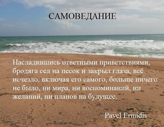 Бродяга медленно приближался к морю, наслаждаясь пением птиц и свежими порывами ветра, через низко бегущие осенние облака то и дело выглядывало Солнце, напоминая о прошедшем лете. Редкие прохожие были заняты своими мыслями и словно тени, проплывали мимо наслаждающегося жизнью бродяги, не обращающего на них никакого внимания. Подойдя к границе, после которой пространство до моря занимал песок, он снял свои шлёпки, надетые на босые ноги, и с наслаждением погрузил стопы, проваливаясь в песок, каждая песчинка которого стремилась оставить о себе приятные воспоминания, массируя с каждым прикосновением ноги бродяги. Подойдя к морю, он почтительно поклонился Солнцу, Ветру, Земле, Океану, приветствуя их и выражая глубокую благодарность за возможность общения с Ними. Набрав в ладони воды, поцеловав её, сделал глоток, с наслаждением умыл своё лицо. Волны нежно омывали ноги, освежая и играясь, то накатывая, то убегая, издавая весёлый шум. Ветер, поднимая налитые Солнцем капельки воды, орошал бродя