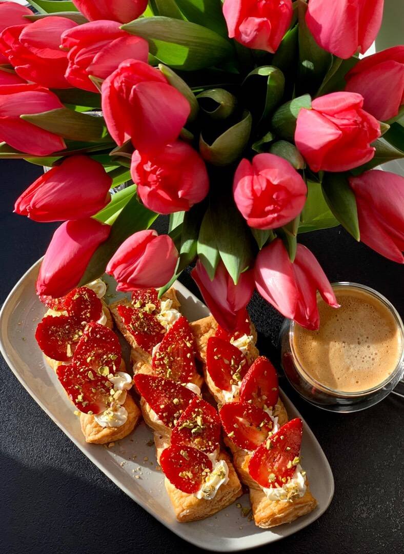 В этом десерте прекрасно всё, от вкуса до подачи. При этом готовится очень просто и быстро! #8марта #слойки #десерт Ингредиенты: пласт слоеного теста (250 гр), клубника, гр крем-чиз, по вкусу сироп, фисташки Способ приготовления: Тесто разморозить, слегка раскатать. Поделить на три части и в каждой полоске сделать продольный разрез. Каждую полоску вывернуть два раза через одну сторону и выложить на противень с пергаментом. Можно смазать молоком. Выпекаем как указано на упаковке теста. Тем временем фисташки измельчить. Крем-чиз смешать с сиропом и переложить в кондитерский мешок. Клубнику нарезать слайсами. В качестве крема можно использовать взбитые сливки. Остывшие слойки покрываем кремом, выкладываем клубнику и посыпаем фисташкой. Очередность можно изменить: крем посыпать фисташкой и поверх выложить лепестки из клубники. Приятного аппетита!