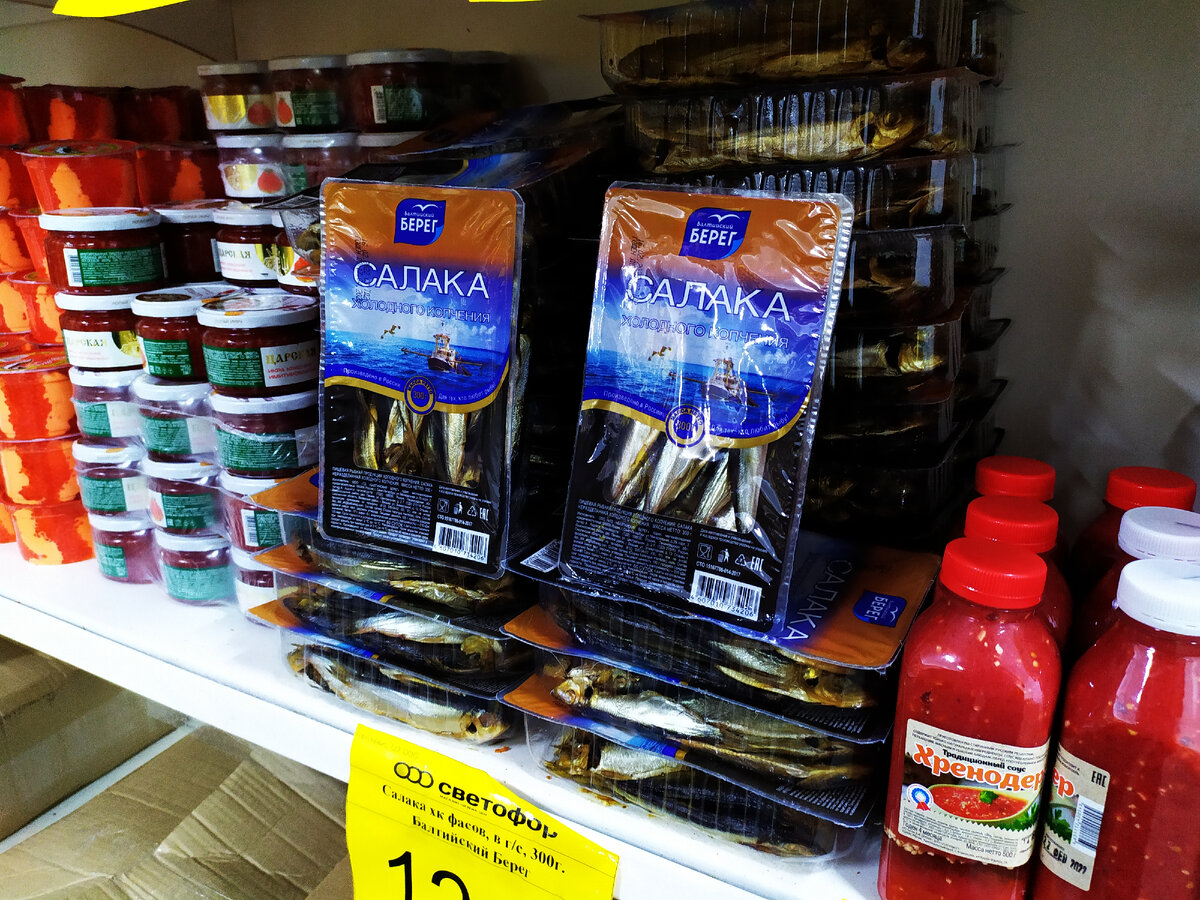 Выгодно, что-то купить и сэкономить минимум 500 рублей у меня получается только в "Светофоре". Даже в это нелёгкое время, в этом магазине вполне неплохой ассортимент товаров и адекватных цен. И в этом обзоре хочу поделиться с вами увиденными новинками и ценами, которые я заметила в "Светофоре" города Новороссийск. В лотке морская рыба салака холодного копчения к пиву, массой 300 грамм. Цена 121 рубль. Свежая свинина на кости со шкурой, большими и маленькими кусками от 4 до 10 кг. Цена 209 рублей за 1 кг. В пластиковой бутылке острый соус "Хренодёр", массой 500 грамм. Цена 89 рублей. Немного жидковата и вкус на любителей таких вещей. В ведёрке шампиньоны по-корейски с морковью, массой 550 грамм. Цена 87 рублей. В вакуумной упаковке полукопчёная колбаса "По-Черкизовски", массой 350 грамм. Цена 75 рублей. Копчёный деликатес из свинины "Зареченский", в вакуумной упаковке по 700-900 грамм. Цена 319 рублей. Сухая сырокопчёная колбаса "Премиум", в вакуумной упаковке по 3 штуки. Цена 330 рубле