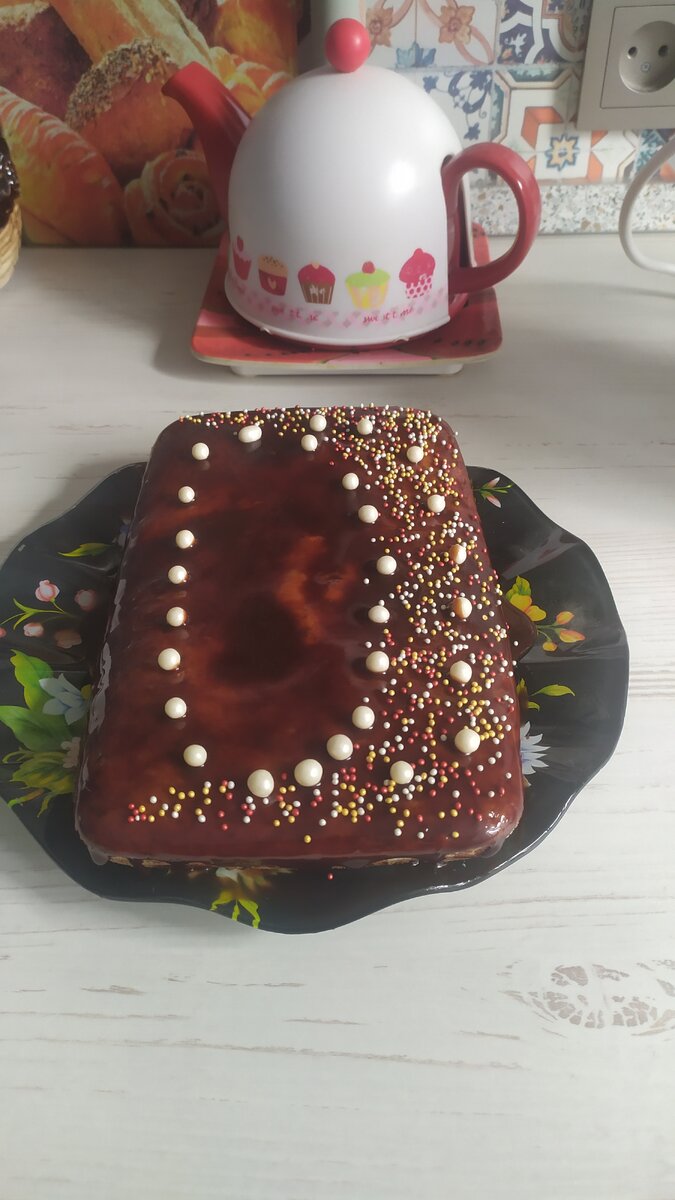 Добрый день! Захотелось мне себя в праздник угостить сладким и вкусным, и пост для этого не помеха. Испекла я постный торт "Мулатка". Понравилось не только мне, но и домочадцам. Приготовить его не составляет труда, очень простой рецепт. Продукты для теста: 1 стакан крепкого чая (от крепости и цвета чая будет зависеть цвет коржа). В следующий раз надо будет попробовать вместо черного чая взять каркаде или кофе. Провести эксперимент. 2 стакана муки, 0,5 стакана сахара, 0,5 ч. л. соды, гашенной уксусом, 0,5 ч. л. соли, 2 ст. л. растительного масла, 2 ст. л. любого варенья - я взяла протерку крыжовник с апельсином. Перемешиваем все продукты, муку и соду добавляем в последнюю очередь. Получается жидкое тесто. Лирическое отступление - люблю жидкое тесто - просто выливаешь в форму, оно само выравнивается, коржи раскатывать не надо. Форму смазываем растительным маслом и посыпаем дно и стенки панировочными сухарями. Выливаем тесто. Ставим в разогретую до 200 градусов духовку. Выпекаем до зо