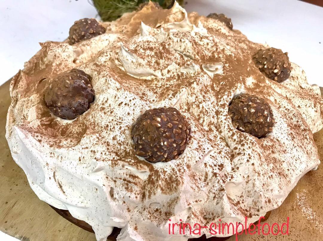 #8марта #торт Ингредиенты: Для теста:, яйца, меда, гречневой муки, пшеничной муки, разрыхлителя, молотых ядер фундука, крепкого холодного кофе для пропитки, Для начинки:, груши, сок половинки лимона, Для крема:, сливок жирностью от 33%, ванилина, закрепителя сливок, кофе 3 в 1, сахара, Для украшения:, конфет Фереро роше, какао-порошок Способ приготовления: Приготовить тесто: яйца взбить с мёдом. Гречишную и пшеничную муку смешать с разрыхлителем, добавить в яично-медовую смесь, добавить измельчённый фундук, хорошо перемешать. Дно формы для выпечки (диаметр 23 см) выстелить пергаментом, вылить тесто. Выпекать 35 минут в духовке разогретой до 175’С. Корж остудить не вынимая из формы, затем перевернуть, пергамент снять, пропитать холодным кофе, уложить очищенные и нарезанные тонкими ломтиками груши, по центру выложить горкой, сбрызнуть лимонным соком. Сливки взбить в плотную массу с сахаром, постепенно ввести ванилин, кофе 3 в 1, закрепитель для сливок. Выложить горкой поверх груш, уложит