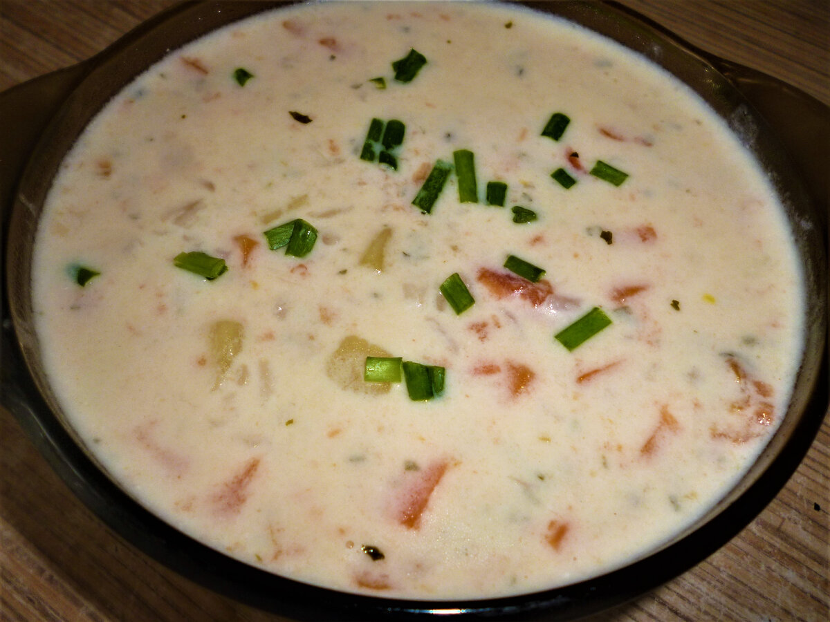 Горячий сметанный суп. Без мяса и бульона, но изумительно вкусный. Когда хочется чего-то необычного.