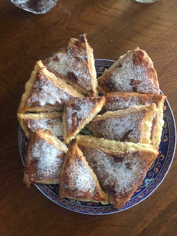 Эти слойки получаются очень вкусные ... главное не очень сладкие.... подходят к чаю. Их можно приготовить разными начинками.. как с крошкой... так и и с любым орехом. Ингредиенты: холодного сливочного масла,, кефира,, разрыхлителя для теста (~10 гр),, муки, крошка для начинки, сливочного масла,, муки (~120 гр), сахара (~150 гр), ореховая начинка, орехи, сахар Способ приготовления: Муку, смешиваем с разрыхлителем. Очень холодное масло натираем на терке и соединяем с мукой. Добавляем кефир и хорошо размешиваем. Готовим тесто и оставляем отдыхать на 2 часа. Тесто делим на 6 равных частей. Каждый часть раскатываем тонко на пласты. Первый пласт посыпаем начинкой из крошки и покрываем его вторым пластом и снова посыпаем крошкой и сверху покрываем третий пласт и немного прижимаем руками. Разрезаем на треугольники. Застилаем противень пергаментной бумагой и кладем будущие слойки на противень и ставим разогретую духовку при температуре 180 гр. и печем 25 минут. Готовые слойки остужаем и посыпае