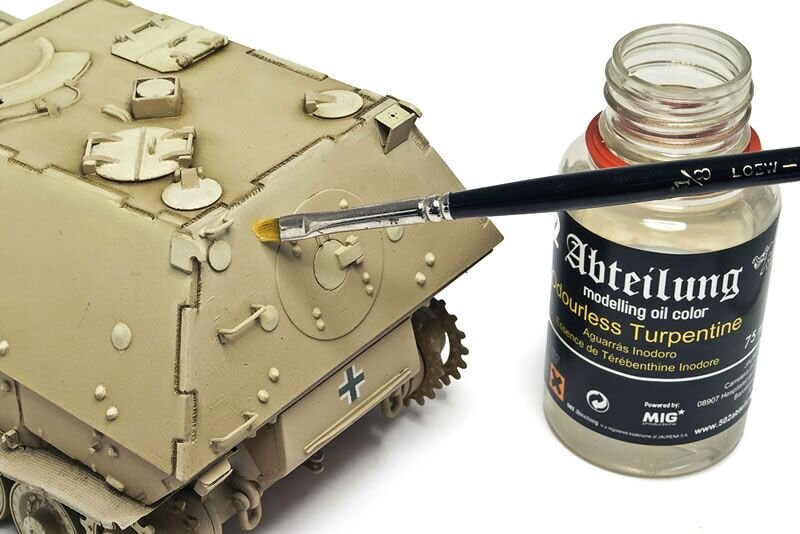 Многим нравятся именно чистенькие аккуратные модели, словно только что сошедшие со стапелей завода. Почему бы и нет? Хрестоматийная техника требует хрестоматийных решений. Прототип новый, свежий. Запылиться ещё не успел, мухи не обсидели. Значит, готовим смывку, которая будет такого же базового цвета, но на тон-полтора темнее. Мы же помним, да: в этом случае смывка - суть - тени от выступающих частей и/или тени во впадинах.
