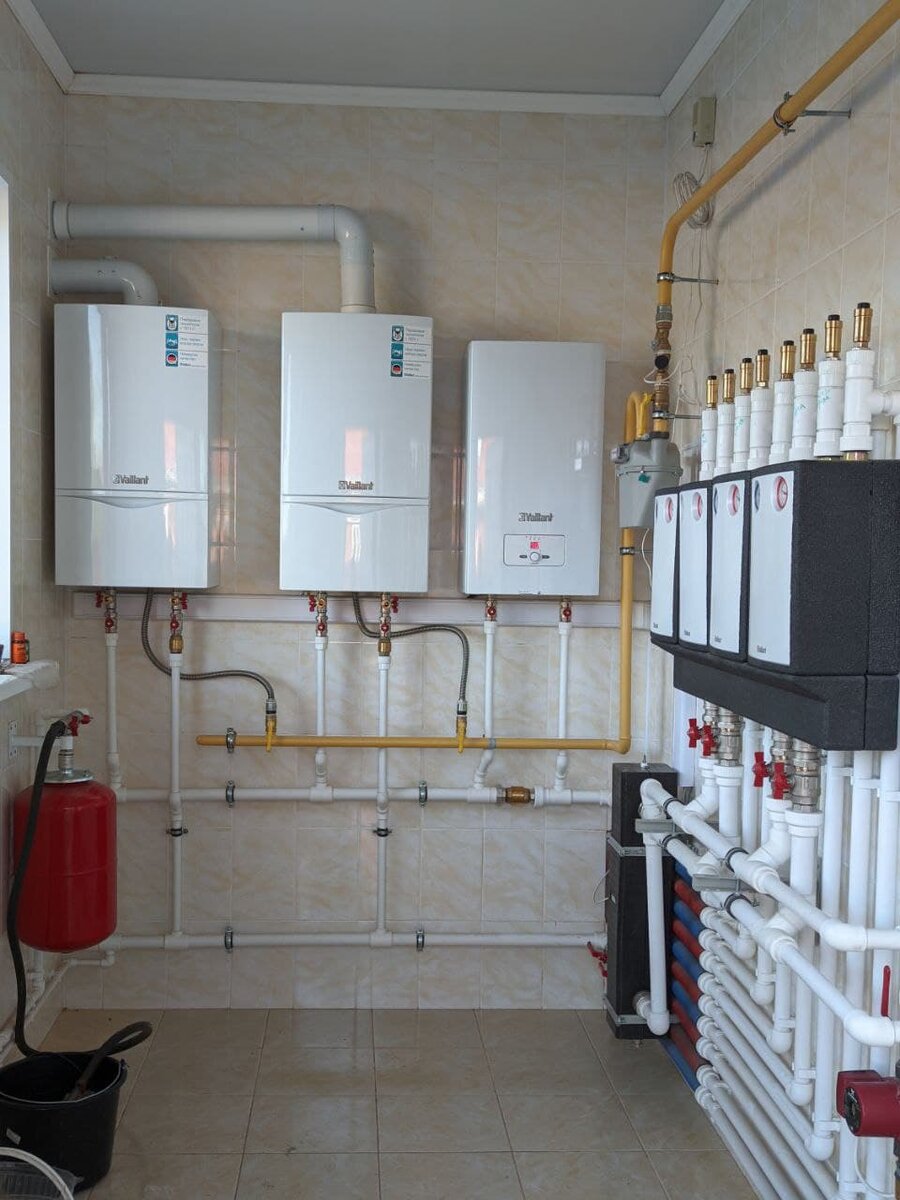Погодозависимая автоматика от компании Vaillant. Задаются параметры и автоматика сама будет регулировать температуру внутри помещения. Каждый контур отопления можно настроить отдельно друг от друга. Что бы не бегать в котельную основной блок управления устанавливается внутри помещения.