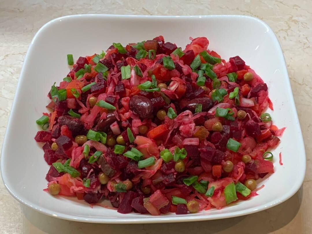 #пост Ингредиенты: свеклы, картофеля, морковь, солёных огурца, консервированного зелёного горошка, консервированной фасоли в собственном соку, квашеной капусты, небольшой репчатый лук, Растительное масло для заправки салата, Зелень для украшения, Соль Способ приготовления: Картофель, морковь и свеклу отвариваем в мундире, остужаем в холодной воде и очищаем. (Картофель и морковь варятся 30 минут, а свекла варится 60 минут.) Нарезаем овощи кубиками одинакового размера. Нарезанные овощи складываем в большую миску. Солёные огурцы и репчатый лук тоже нарезаем кубиками. Добавляем к овощам консервированный горошек, фасоль, огурец, лук и квашеную капусту. Солим, перемешиваем и заправляем растительным маслом. Перекладываем в салатник и посыпаем нашинкованной зеленью.