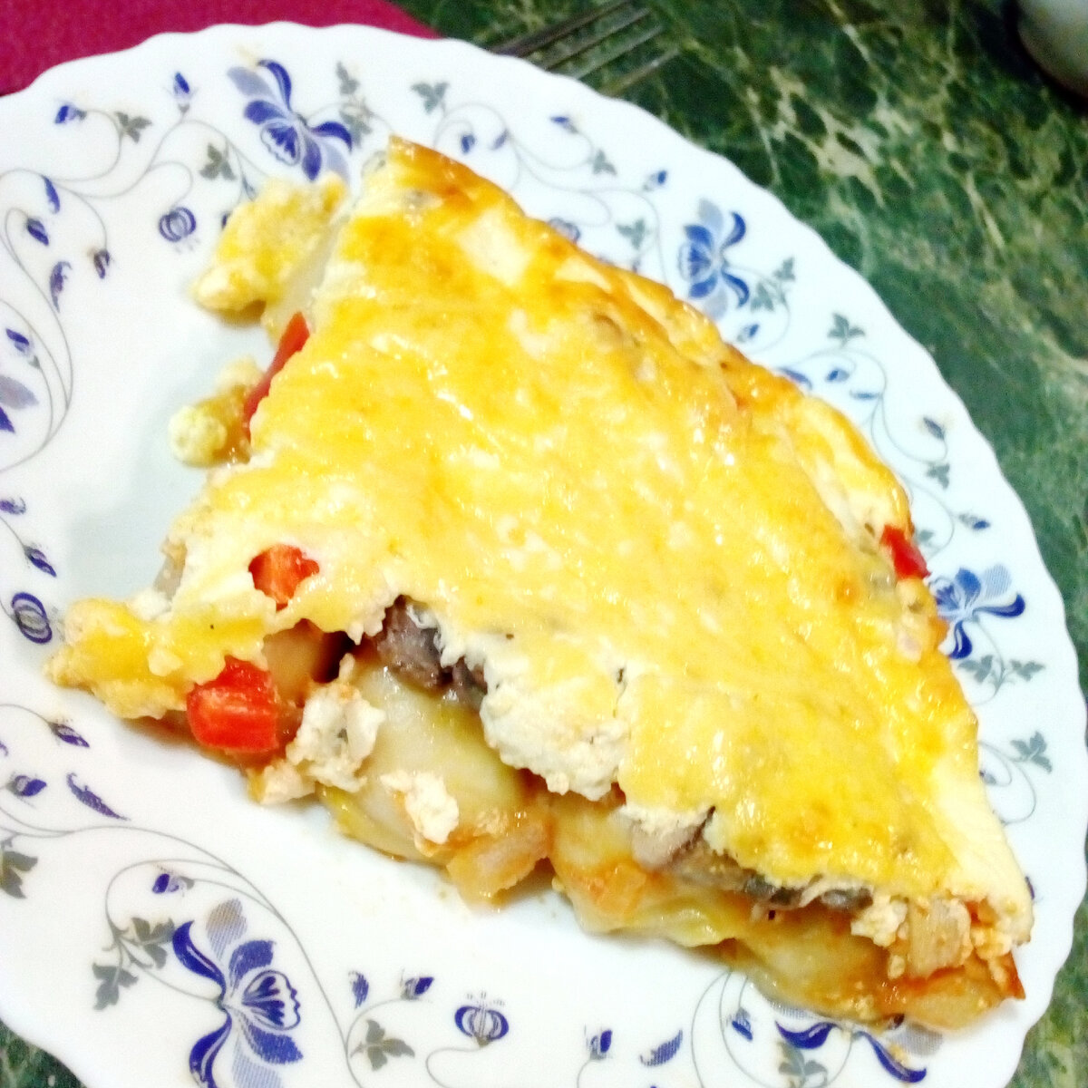 Дальше не обязательные ингредиенты на ваш вкус. У меня это помидор, сладкий перец и шампиньоны. Это может быть и шпинат и сельдерей, фенхель, брокколи, кабачки, зеленый горошек. Из зелени в запеканку можно добавить укроп, базилик, петрушку, черемшу.