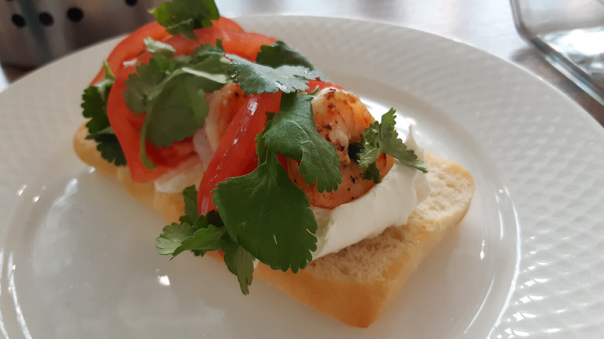 Очень быстрый и простой рецепт для завтрака от кулинарной студии Ю.Высоцкой понадобится на 2 порции: чиабатта - 1 шт креветки - 8 шт помидоры - 1 крупный творожный сыр - 100 г кинза (по желанию) - 20 г чеснок - 1 зубчик масло оливковое - 1 ст л 1. Почистить креветки. Замариновать их в смеси: раздавленный зубчик чеснока, оливковое масло, веточка тимьяна, стебли кинзы, соль, свежемолотый черный перец, веточки тимьяна. Оставить в этой смеси на 5-10 минут. 2. Поставить сковороду на средний огонь. Чиабатту нарезать ломтиками, если маленькая - разрезать пополам. На сковороду налить 1 ст л оливкового масла и слегка обжарить кусочки чиабатты с обеих сторон. Можно в масло положить веточку тимьяна для аромата. 3. Убрать чиабатту со сковороды, выложить креветки. Быстро их обжарить по 1 минуте с каждой стороны. Выключить огонь. 4. Чиабатту щедро смазать творожным сыром, выложить тонкие ломтики помидоров, креветки, украсить все кинзой (если любите; мы - любим). Приятного аппетита!