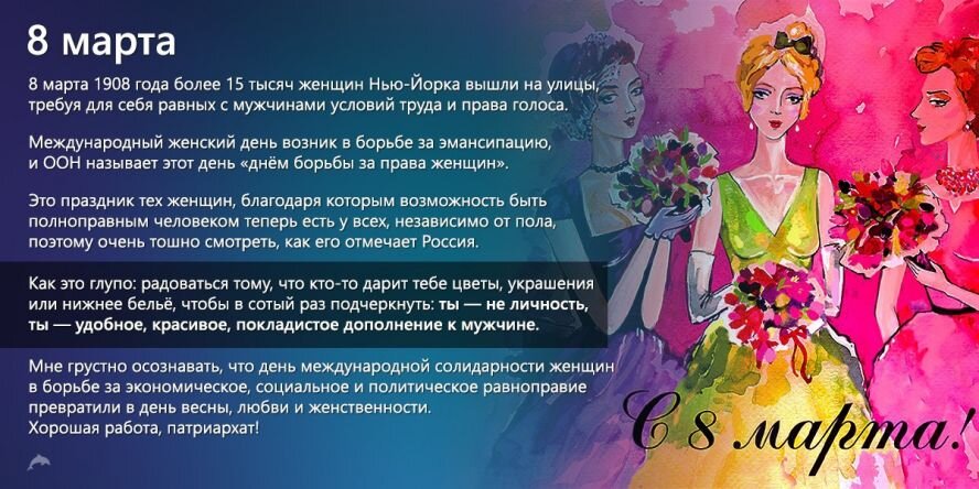 С 8 марта! В 2022-м году мир в 102-й раз отмечает Международный женский день. В России это один из самых любимых праздников, хотя его смысл сильно искорежили: из идеалогического чествования женщины праздник превратился в день весны и красоты. Однако не стоит забывать, откуда ноги растут, и что на самом деле представляет из себя 8 марта, а именно: это день солидарности женщин в борьбе за РАВНЫЕ ПРАВА и ЭМАНСИПАЦИЮ. Не буду углубляться сейчас именно в тему феминизма, просто хочу сказать: женщины, мы- крутые! Как бы патриархальное общество ни пыталось столкнуть нас лбами друг с другом, пропагандируя невозможность женской дружбы, как бы окружающие ни старались внушить, что женщина стоит ниже мужчины и обязана считать его главным, мы всё равно идём вперед, исполняем свои мечты, дружим и развиваемся. Женщина почти во всём сильнее и выносливее мужчины, разве что в физической силе уступает и то не всегда. Из 100% альпинисток до вершины Эвереста доходят 60% женщин, из 100% альпинистов- только 4