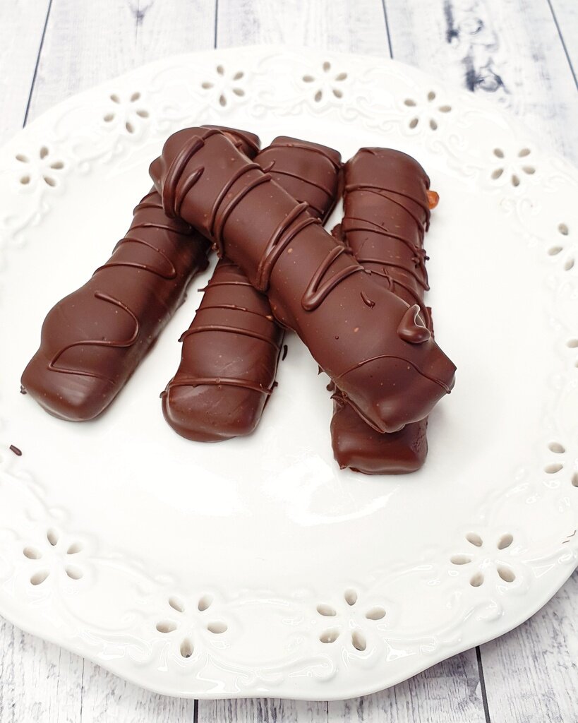 Этот рецепт нашла здесь. За что благодарю автора. Увидев ее фотографии, сразу захотелось приготовить. Очень понравились. Дети сказали, как в магазине. Правда, глазировала я не молочным шоколадом, а темным, чтобы не было очень сладко. Песочное тесто: 150 г муки 50 г коричневого сахара 100 г сливочного масла 10 г молока соль щепотка разрыхлителя Приготовление: Мягкое масло смешать с сахаром и молоком. Добавить муку, соль и разрыхлитель, быстро замесить тесто. Раскатать между 2 листами пергамента 3-4 мм толщиной, можно и толще, если любите побольше печенья. Охладить, нарезать на полоски 12х2.5 см. Охладить. Выложить на противень и выпечь при 175-180С 12-15 минут до золотистого цвета. Охладить. Карамель: 230 г сахара 150 г сливок 80 г сливочного масла щепотка морской соли Сахар растопить в сотейнике: сначала насыпаете тонкий слой и греете на среднем огне. Как только сахар начнет плавиться, подсыпаете в эти места сахар. Так растапливаем весь сахар, когда сахар растопится больше половины, м