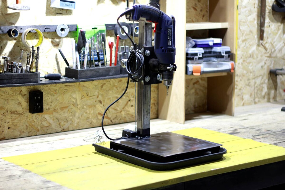 Всех приветствую, друзья! Данный материал – продолжением моих изысканий на тему самодельной стойки для дрели. В первой части я попробовал более простую конструкцию, а теперь сделал совершенно иначе. Стойка вышла прекрасная, полностью рабочий вариант с хорошей точностью и регулировками. Видео Кому не хочется сегодня читать, предлагаю посмотреть ролик. В нем я все рассказал, протестировал и посчитал Особенности Прототип из первой части меня не устраивал от слова совсем. Он люфтил и я не смог добиться строго вертикального сверления в профильной трубе. Т.е. входное отверстие по центру, а выходное с краю. Согласитесь, это ерунда! Платформа (столешница) осталась как и была. В ней нет ничего сложного и ее можно оставить. Но у меня появился лист металла 1,5мм. И я закрыл столешницу этим листом. Теперь вид стал законченный и эстетичный! Каретка Полностью удалена старую версию вертикальной направляющей и сделал новую. Для этого взял профтрубу 40*40 длиной 50см. Затем сделал каретку из профтрубы