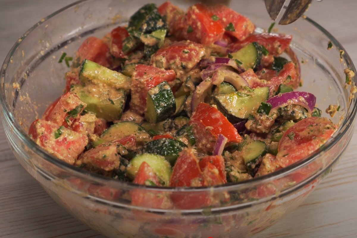 Что бы приготовить овощной грузинский салат,на понадобиться: Для заправки нам понадобиться: Начинаем готовить: Нарезаем помидоры на дольки, потом добавляем к ним порезанные огурцы в виде полукруга. Нарезаем зелень(для лучшего вкуса,можно её не резать а порвать в ручную). Режим лук на полукольца. После начинаем мелкими кубиками нарезать перец чили. Готовим заправку: Берём блэндер, в него засыпаем порезанные на половинки помидоры черри. Добавляем один зубчик чеснока,грецкие орехи,кориандр,сок лимона,оливковое масло, петрушку,базилик и солим по вкусу. И превращаем всё в однородную массу.