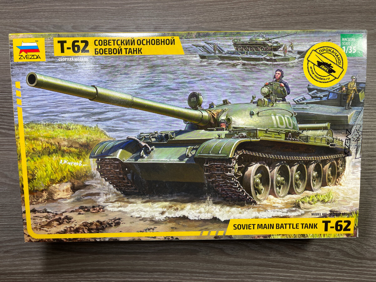 Друзья всем привет! Новинка конца 21 года, все ждали данный танк от Звезды. По итогу вышел очень даже хороший набор. Т.к. я делал предзаказ в Арма-Моделс, я получил немного бесплатных допов и накупил много всего еще :) Но вначале пройдемся по набору в целом. Краткая справка Т-62 (Объект 166) — советский средний и основной боевой танк первого поколения. Создан на базе танка Т-55. Производился в СССР с 1962 по 1975 год. Первый в мире серийный танк с гладкоствольным орудием, и массой среднего танка при высоком уровне бронирования. Основным средним танком на вооружении СССР на протяжении 1950-х годов оставался Т-54/55. Несмотря на постоянное совершенствование танка, в том числе и повышение огневой мощи, вооружение его, состоявшее из 100-мм нарезной пушки Д-10Т, оставалось прежним. Д-10Т, к которой до 1961 года имелись лишь калиберные бронебойные снаряды, к середине 1950-х годов уже не обеспечивала эффективного поражения нового американского среднего танка M48, в то время как западные танк