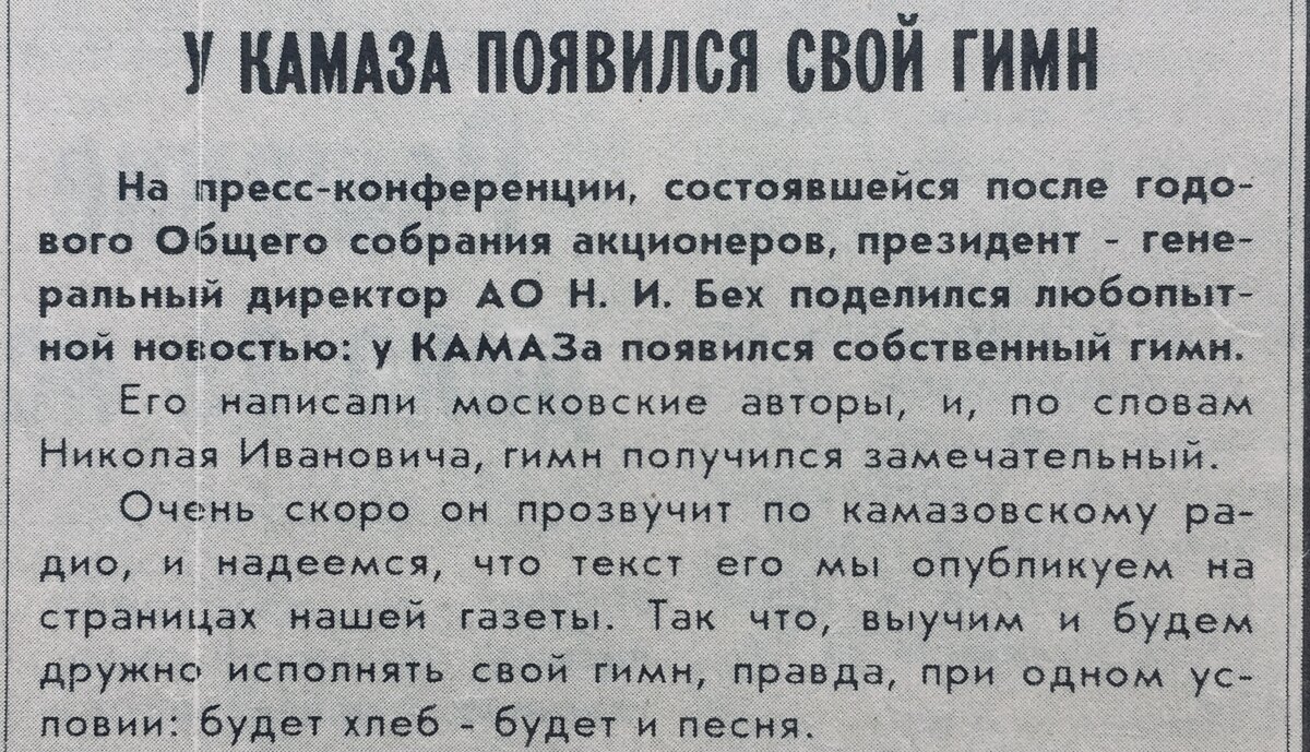 Мало кто знает, что у КАМАЗа был свой гимн. Об этом сообщает газета «Вести КАМАЗа» от 30 мая 1996 года. К сожалению, не удалось найти пока ни аудиозапись, ни текст этого гимна. Но сегодня покажу вам слова и ноты трёх песен о КАМАЗе. Это, конечно, не гимны, но очень хорошие песни. Внизу слова и ноты песни «А зовут меня КАМАЗ», опубликованные в газете «Социалистическая Индустрия на строительстве Камского автозавода» от 26 апреля 1973 года. Текст и ноты песни «КАМАЗ», опубликованные в журнале «Огонёк», №21 за 1978 год. Песня о КАМАЗе. Середина 1970-х годов.