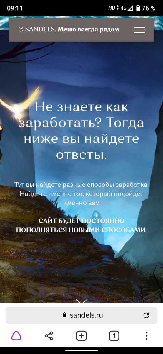 Я простой обычный парень. С такой же ленью как и многие. С теми же страхами и проблемами. Я НЕ зарабатываю миллионы а работаю на обычной работе за оклад. Но постоянно читаю, узнаю и пытаюсь найти способы как заработать деньги. Как открыть свое дело, с чего начать и тд. Вы наверняка видели такие статьи как 100 способов заработка. И если перечитать то там какие то кликай мышкой весь день и получи 50 копеек. Отзовик и тд. И я решил создать собственный сайт на котором совершенно бесплатно буду публиковать мысли и идея для заработка. Почему я не занимаюсь ими? Где-то мне не хватает жилки а какие-то способы мне не подходят. Кому-то возможно они зайдут. Вообще постоянно читая и узнавая новые способы я надеюсь найти свою нишу. А пока я ее не нашел я решил что буду делиться с вами. Заходите на сайт Sandels.ru Читайте узнавайте. Там нет прямо бумовых новых тем но идеи рабочие и возможно именно они на толкнут вас на что-то собственное? Как только я нахожу действительно толковый способ я описываю