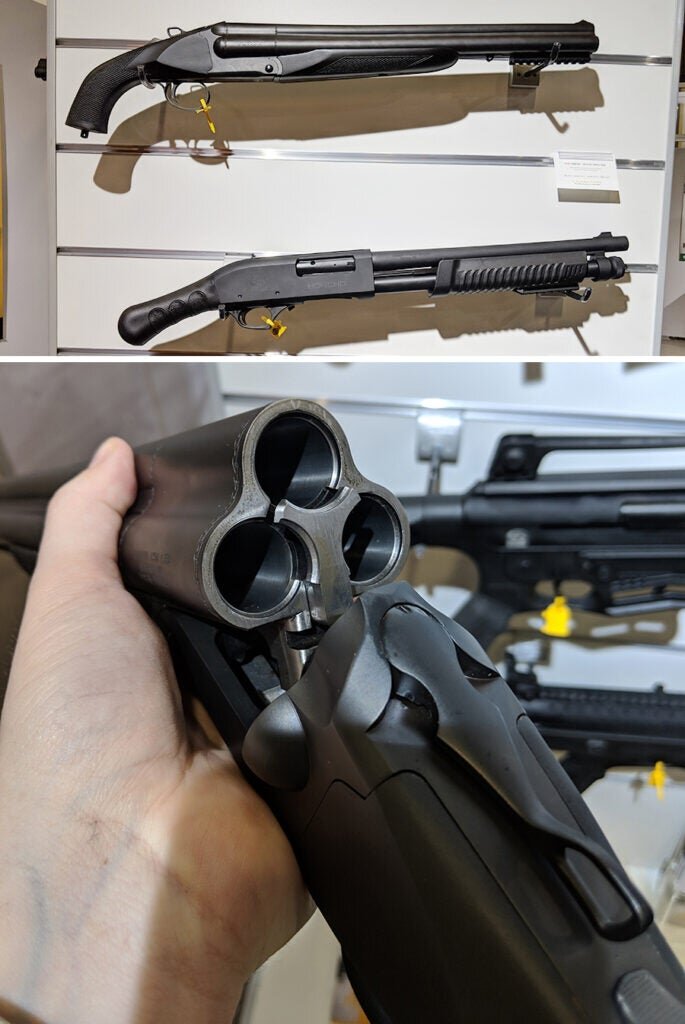 Американский производитель оружия Charles Daly, известный своими экстремально компактными дробовиками, выпускает, среди прочих, интересную и необычную модель – Honcho Tactical Triple. Она представляет собой, как следует из названия, дробовик-трёхстволку переломной конструкции с гладкими стволами длиной 18,5 дюймов (примерно 47 сантиметров) и синтетической ложей. Блок стволов треугольной формы (один ствол вверху, два – внизу). Общая длина ружья – 27 дюймов (или примерно 68,5 сантиметров). Сами стволы при этом получились длиннее, чем у помповых и полуавтоматических компактных ружей схожих габаритов, и вот почему. Помповые и полуавтоматические конструкции требуют горизонтального пространства для перемещения гильз вперёд и назад (в патронник и из него). В данной модели гильзы уже находятся в патроннике (это ведь «переломка»), поэтому проблем с длиной стволов при сохранении общей компактности оружия у Honcho Tactical Triple не возникает – по сути, в тех же габаритах, что и у «помпы», ство