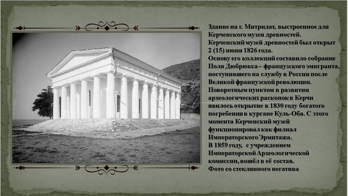 Находясь в составе Министерства внутренних дел и получая с 1835 года государственное финансирование в размере 5000 руб., Керченский музей древностей несколько лет спустя обладал не только богатейшим собранием античных памятников Северного Причерноморья, но и стал фактически центром классической археологии на юге России. Только для него было построено на средства казны здание в античном стиле – копия храма Гефеста в Афинах – на склоне горы Митридат, вблизи бывшего акрополя Пантикапея. «Русская Помпея» – так тогда называли Керчь.