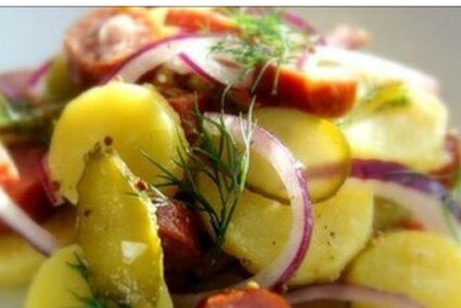 На 10 порций Время приготовления 2 часа, время маринования примерно 2 часа. 1. Мясо быстро помыть в холодной воде и положить в кастрюлю. Налить воды, чтобы она покрыла мясо, добавить зерна перца и лавровый лист и довести до кипения, затем варить на маленьком огне без крышки около часа. 2. Овощи для супа почистить, помыть, нарезать, положить в кастрюлю и всё вместе поварить еще примерно полчаса. 3. Пока варится мясо, сварить картофель в небольшом количестве подсоленной воды, Слить, почистить и нарезать. 4. Мясо вытащить из бульона, отделить от костей и нарезать кубиками в 2 см. Бульон процедить. 5. Корешки сельдерея почистить, помыть и нарезать тонкими кружками. Зелень мелко порубить. Редиску почистить, помыть и разрезать на четыре части. Листья редиски тоже мелко порубить. 6. Картофель, мясо, сельдерей, редиску и рубленую зелень сложить в большую салатницу. 7. Луковицу почистить и мелко нарезать. В 200 мл бульона положить нарезанную луковицу, добавить растительное масло,