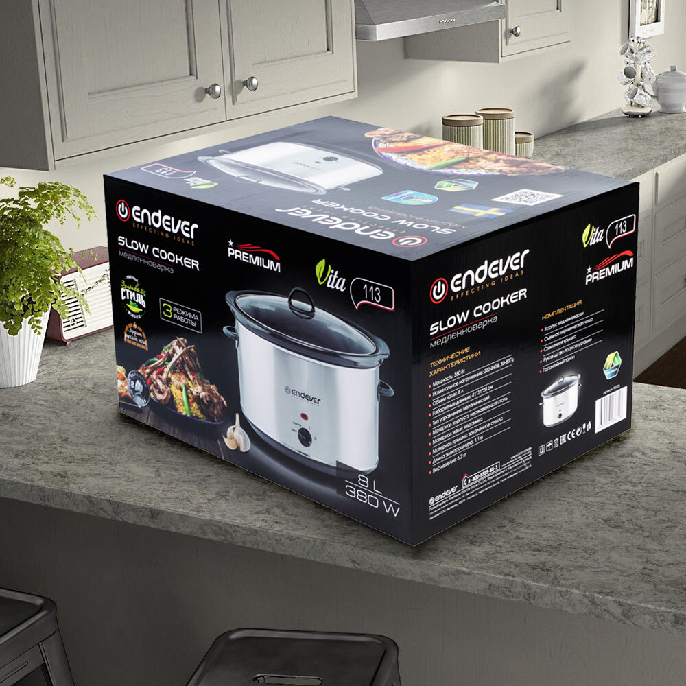 На глаза попался хороший обзор распаковки нашей медленноварки на очень известном портале. Не могли пройти мимо - публикуем: Пришла хорошо упакованная, ничего особо не помялось, коробка целая, выполнена стильно, со всеми описаниями и подробными изображениями. Как только получил, понял, что это именно тот самый гаджет, но в новом исполнение, который я хотел попробовать. Олды, наверное, вспомнят такие штуки, но в стальном исполнении одного из оборонных предприятий. Были у них еще какие-то альтернативные названия, типа кашеварок. Упаковка Внутри все аккуратно сложено: сам прибор, крышка, инструкция. Все проложено пенопластом и думаю она бы пережила доставку «Почтой». На коробке перечислены технические характеристики устройства, указана комплектация и немного дополнительной информации. Как я писал выше, на медленноварку я засматривался и искал давно, в итоге выбрал вариант от ENDEVER Vita-113 на 8 литров. Так как я любитель мяса — рагу, пловов, просто тушеного, считаю, что такой прибор мне