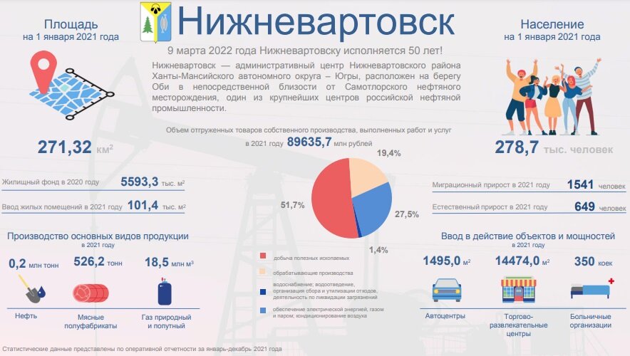 Сегодня, 9 марта, Нижневартовск отмечает день рождения – одному из крупнейших муниципалитетов Югры исполняется 50 лет. «50-летие муниципалитета планируют отмечать в течение всего 2022 года. Часть праздничных мероприятий состоится в марте и будет приурочена к официальной дате, а именно 9 марта 1972 года Нижневартовску был присвоен статус города. Еще один этап юбилейных торжеств ждет жителей в дни проведения традиционного фестиваля искусств, труда и спорта «Самотлорские ночи» в июне», - рассказали в пресс-службе администрации города. Уже идет флешмоб «Росли вместе с городом», который запустил Нижневартовский краеведческий музей. «Также коллектив создал в социальных сетях несколько проектов, рассказывающих о становлении города – «Нижневартовск – история села», «Нижневартовский календарь событий». Отмечу, каждое учреждение социальной сферы реализует свои идеи к юбилею города в форматах онлайн и офлайн. Во Дворце искусств откроется художественная выставка «Нижневартовский сюжет», на которой