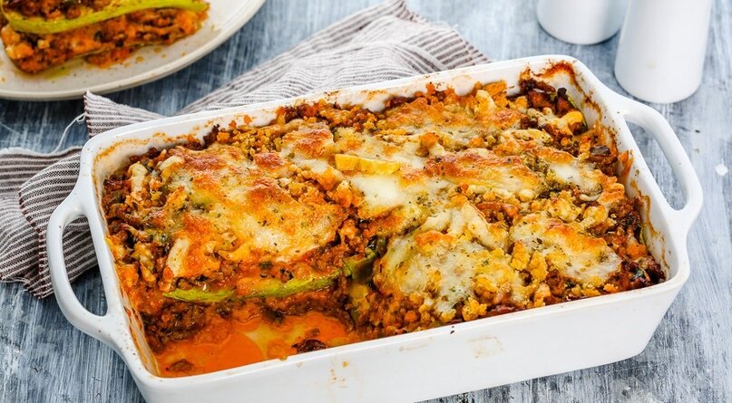 ИНГРЕДИЕНТЫ ПОШАГОВЫЙ РЕЦЕПТ ПРИГОТОВЛЕНИЯ Шаг 1 Разогрейте духовку до 175˚С. Нарежьте кабачки вдоль на пластины толщиной 7-8 мм, положите на противень, застеленный пергаментом, немного посолите. Поставьте противень в духовку и запекайте кабачки 15-20 мин. Шаг 2 Очистите лук и чеснок. У перца удалите семена и перегородки. Нарежьте лук и перец маленькими кубиками, чеснок измельчите. Шаг 3 Разогрейте оливковое масло в большой сковороде на среднем огне. Добавьте чеснок, лук и перец и жарьте 7-10 мин., до мягкости. Добавьте в сковороду фарш и продолжайте жарить, разбивая комочки фарша лопаткой, 5 мин. Влейте измельченные помидоры, добавьте хлопья чили, орегано, базилик и петрушку и тушите на медленном огне 30 мин. Посолите, поперчите и снимите с огня. Шаг 4 Срежьте корки с хлеба и раскрошите мякиш. Поджарьте крошки на сухой сковороде до золотистого цвета. Шаг 5 На дно прямоугольной формы для запекания насыпьте немного обжаренных хлебных крошек, затем выложите слой кабачков. Полейте мясны