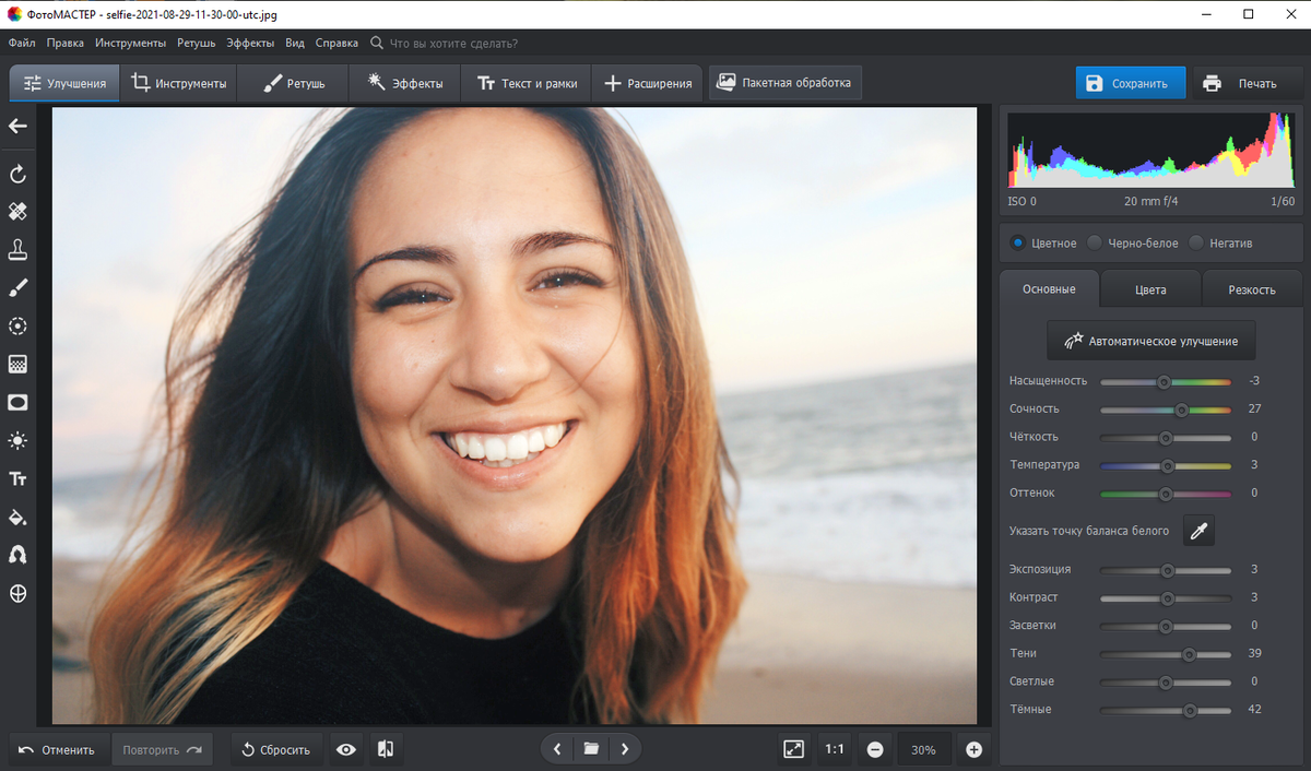 Как сделать красивое селфи? Почему некоторые фото набирают кучу лайков в Instagram за считанные минуты, а другие остаются неоцененными? В этом видео мы раскроем секрет, как сделать идеальное селфи в Инстаграм. Начиная с выбора локации, идеи и лучшей позы для селфи и заканчивая правильным расположением света. Оказывается, на подготовку домашней фотосессии также требуется время. По крайней мере, его можно сэкономить на макияже. Убрать прыщики и выровнять тон кожи можно в программе ФотоМАСТЕР. Как вам такой лайфхак для селфи в Инстаграм? 😉 Все просто: загрузите материалы в редактор и перейдите во вкладку «Ретушь». В ней есть удобные опции для обработки лица. Например, «Идеальный портрет». Эта функция включает множество готовых пресетов. Заменить фон можно в разделе «Инструменты». Как сделать цветокоррекцию для селфи удачно? Во вкладке улучшения есть ползунки, которыми удобно управлять. Вы без проблем найдете оптимальные значения света, тени, контраста и других параметров. ✅ Скачать Фото