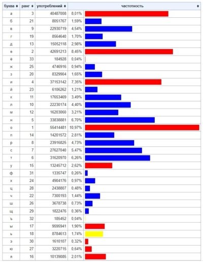 Материал не содержит стопроцентных способов победить машину, а просто некоторые соображения. 1. Некоторые буквы алфавита более распространены. Некоторые меньше. Логично, чтобы отсечь варианты слов, нужно использовать в первом варианте самые распространённые. В прошлой статье я писал об опыте англоязычного товарища, но там его схема учитывала не только распространённость, но и позицию буквы. Именно для того, чтобы с каждым следующим шагом оставалось меньше вариантов. На картинке русские буквы. Видно, что из гласных самые распространённые О, А, Е, И. Из согласных Н, Т, С, В. Для частного случая нам нужно составить слово из 5 букв из них, например, СТЕНА. Так мы отрежем много вариантов возможного ответа. 1.1 Но есть и неправильный вариант: постараться отсечь буквы и слова, которые не очень распространены. Например, НЕФТЬ или ТЮФЯК. Есть разные стратегии, но эта уступает основной. 2. Хватит ли попыток, чтобы выиграть? Ответ: Да. Нам даётся 6 попыток, и если мы сначала будем отсекать гласны