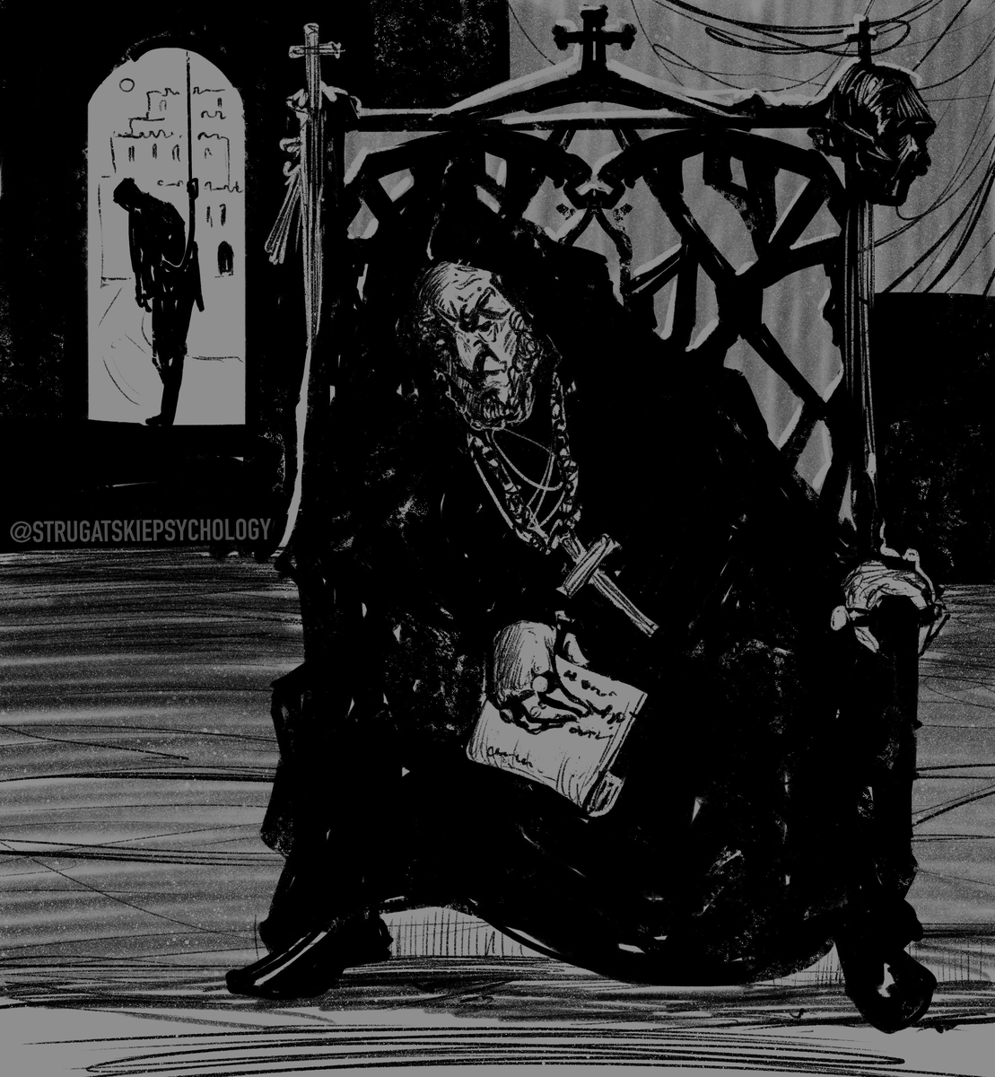 Гур Сочинитель вдруг принялся шептать так тихо, что Румата едва слышал его сквозь чавканье и гул голосов: – А зачем все это?.. Что такое правда?.. Принц Хаар действительно любил прекрасную меднокожую Яиневнивору… У них были дети… Я знаю их внука… Ее действительно отравили… Но мне объяснили, что это ложь… Мне объяснили, что правда – это то, что сейчас во благо королю… Все остальное ложь и преступление. Всю жизнь я писал ложь… И только сейчас я пишу правду… Он вдруг встал и громко нараспев выкрикнул: Велик и славен, словно вечность, Король, чье имя – Благородство! И отступила бесконечность, И уступило первородство! Король перестал жевать и тупо уставился на него. Гости втянули головы в плечи. Только дон Рэба улыбнулся и несколько раз беззвучно хлопнул в ладоши. Король выплюнул на скатерть кости и сказал: – Бесконечность?.. Верно. Правильно, уступила… Хвалю. Можешь кушать.