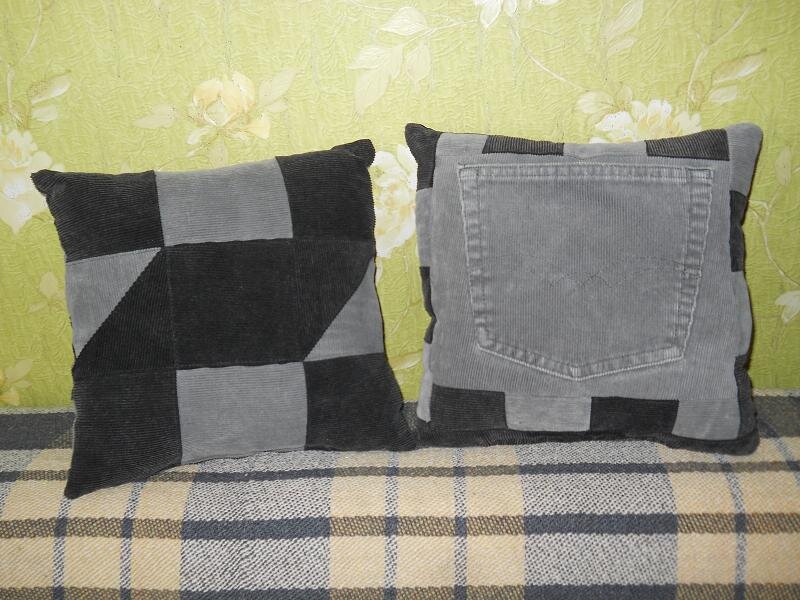 Декоративные подушки для дивана можно сшить из чего угодно. Это могут быть обрезки мебельных тканей, старые джинсы или любая текстильная вещь, которая уже не используется по назначению. Набивка тоже может быть разной, от ваты и синтепона до сухих трав. Но проще купить готовые подушки и сшить наволочки на молнии, подходящие именно к вашему интерьеру. Эти подушки сшиты из любимой вельветовой рубашки, и даже вытачки их не испортили. Само собой и подушки стали любимыми. Небольшие обрезки мебельной ткани разного цвета можно скомбинировать в шахматном порядке, или любом другом. Все зависит исключительно от вашей фантазии. Если вы хотите создать свой уникальный интерьер, можно купить немного ткани, которая будет гармонично сочетаться с вашей мебелью. Самый простой вариант - это купить ткань с крупным набивным рисунком, такие подушки не требуют дополнительного декора и прекрасны сами по себе. Эта подушка больше размером и используется детьми для игр на полу, как сиденье. Разноцветный джинс и