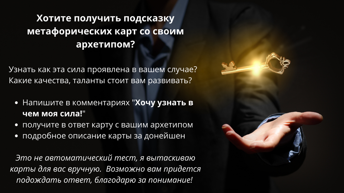 У вас есть сила, полученная по праву рождения. Она приходит к вам от самого первоистока жизненной энергии. Эта сила подключает вас к божественному началу, помогает получать подсказки свыше, дает благословение и защиту. И она же наделяет вас здоровьем и тонким чутьем, поскольку вы причастны к миру живой природы, ко всем живым существам. Психологи называют эту силу архетипами. Каждый чувствует ее проявление по-своему, через разные образы и сюжеты. Но не даром у всех культур и народов сюжеты сказок во многом похожи. Мы все - единое целое на самом глубинном уровне, даже если не помним об этом. Хотите получить подсказку метафорических карт со своим архетипом? Узнать как эта сила проявлена в вашем случае? Какие качества, таланты стоит вам развивать? Хотите получить подробное описание этой карты? Буду признательна за ваши ЛАЙКИ! Впереди еще много Добрых Знаков для вас, ПОДПИСЫВАЙТЕСЬ чтобы не пропустить! ПОДЕЛИТЕСЬ этим тестом со своими друзьями, пусть и они узнают какие перемены происходя