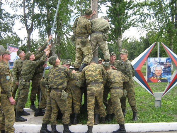 Равняйсь!.... Смирно! Равнение на середину! Флаг Российской Федерации поднять! С этих команд при исполнении ежедневного ритуала подъёма флага и исполнения Гимна России начинался каждый утренний развод в полку. Однажды случился конфуз - после команды к подъёму флага произошёл отказ флагштокового устройства - проще говоря порвалась верёвка на которой поднимался флаг, и он соответственно упал. Командир полка немедленно приказал флаг поднять, и повесить. За флаг отвечал наш батальон, даже, ЕМНИП наша 6 ПДР. Потому команда к нам непосредственно относилась. Ну а как его повесить то на высоченный флагшток? Но задачу следовало выполнить немедленно и во что бы то ни стало, любой ценой то есть. Флаг всёж-таки, вещь священная! Мы бегом выдвинулись к месту происшествия и под руководством командира роты начали его вешать. Как на известной американской фотке, бойцы выстроили огромную живую пирамиду, и по телам сперва, а потом и по фонарному столбу к верху флагштока вскарабкался один из солдат. Час