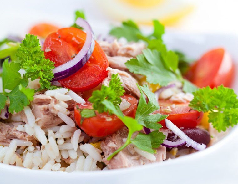 в собственном соку Время приготовления 40 минут. 1. Рис сварить в подсоленной воде, согласно указаниям на упаковке, дать хорошо стечь и охладить. 2. Тунца выложить из консервных банок в миску и измельчить двумя вилками. 3. Сладкий перец помыть, разрезать пополам, удалить зёрнышки и нарезать маленькими кубиками. 4. Зелёный лук почистить, помыть и нарезать тонкими колечками. (или порезать красный лук, тоненькими полукольцами) 5. Помидоры разрезать на восемь частей и удалить плодоножку. 6. Сладкий перец, лук и помидоры положить в миску с рыбой. Кресс-салат помыть и нарезать кухонными ножницами. 7. Смешать майонез с лимонным соком и горчицей. Посолить, поперчить, добавить растительное масло и чеснок, предварительно почищенный и измельчённый в чеснокодавилке. Соус ещё раз размешать и полить им салат. 8. Всё перемешать, накрыть крышкой и дать настояться 20 минут. #вкусныйобед #блюдастунцом #салатизрисастунцом #пп #полезныйобед