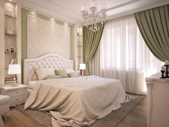 Ламбрекены — подойдут для спален, оформленных в классическом стиле. Выглядят дорого и стильно. С их помощью можно замаскировать карниз, визуально расширить или наоборот сузить окно.