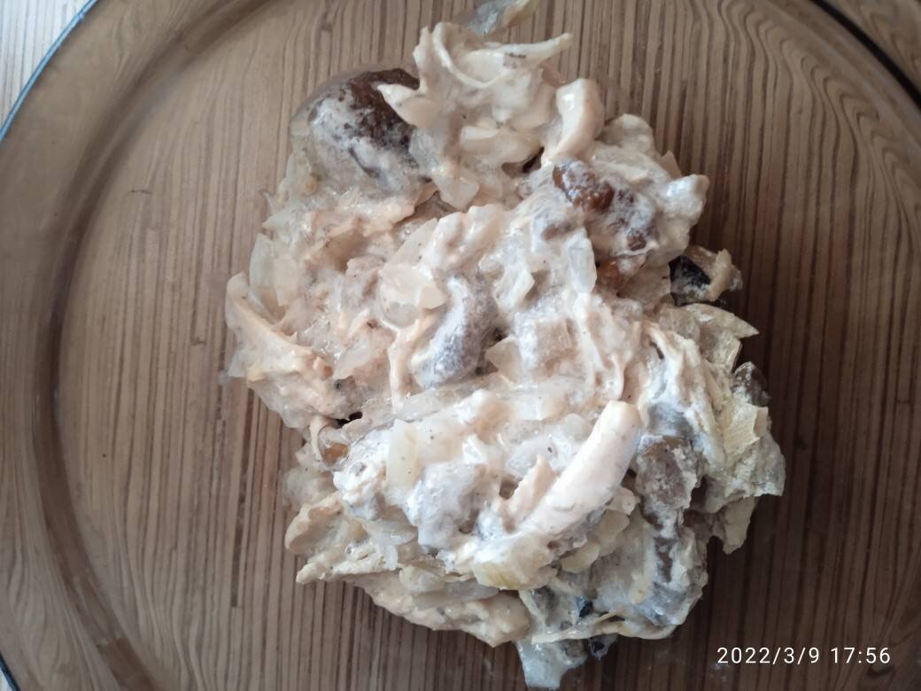 Ингредиенты: Куриное филе или 1 половинка спинки, Грибы, Лук , Соль и перец , бульона, Сметаны не жирной Способ приготовления: Итак, мы отвариваем куриную спинку или грамм 300 куриного филе. Грибы нарезать не большими кусочками. У меня были лесные грибы можно их заменить на шампиньоны. Лук нарезать на тонкие слайсы. На хорошо разогретый сотейник выложить грибы и потом лук. Все потушить до полу готовности. Потом туда добавить готовую куриную спинку. Посолить и поверить по вкусу. Потом туда добавить сметаны и добавить туда немного воды закрыть крышкой. И готовить до готовности. Можно с любым гарниром очень вкусно и аппетитно, приятного аппетита всем.