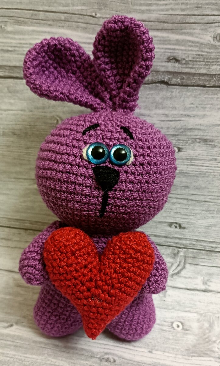 Чтобы вязать крючком милого зайку амигуруми, вам нужно: Пряжа может быть любая, в любом цвете. От толщины нити лишь изменится размер зайчонка. В моем случае это троицкая пряжа Кроха 3880 фуксия для зайки и Кроха 0042 красный для сердечка
