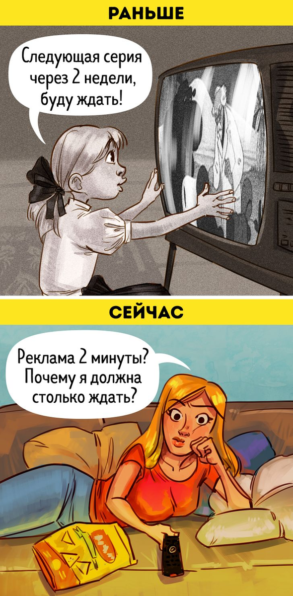 Всем привет! Время мчится с бешенной скоростью. Вы представляете, что на дворе уже 2022 год! По нашим ощущениям еще только 2010... Но время идет и все вокруг нас медленно, но верно меняется. Появляются новые гаджеты, старые привычки становятся частью истории, а взамен приходит новый уклад жизни. Сегодня мы приготовили для вас подборку забавных комиксов, которые расскажут, как успела поменяться наша жизнь. Надеемся, что вы оцените наши старания лайком и подпиской!) 1. Теперь фильмы можно смотреть в удобное для нас время Совсем недавно нам приходилось наизусть учить расписание любимых сериалов и мультфильмов. Мы были готовы часами смотреть скучные передачи, чтобы не пропустить начало новой серии. Однако сегодня таких проблем нет и при желании вы можете посмотреть весь сезон за один вечер! 2. Даже школьное образование изменилось С появлением новых технологий и методик обучения изменилось и школьное образование. Но к лучшему ли эти изменения...Это большой вопрос. А что вы думаете по этому