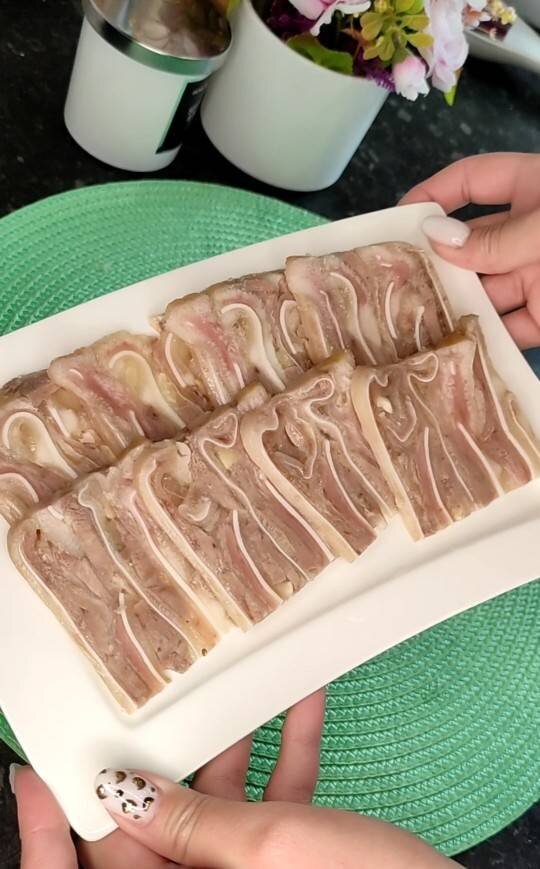 Отличная закуска для праздничного стола и на каждый день на бутерброды. Бюджетная и в тоже время очень вкусная Ингредиенты: Свиные уши, Язык свиной, Чеснок , Лук репчатый, Лавровый лист , Перец горошек, Перец душистый, Кориандр семена, Соль Способ приготовления: Свиные уши хорошо моем и зачищаем. Обрезаем все что не нравится, я люблю только хрящики, поэтому отрезала толстую часть. Заливаем водой, доводим до кипения и варим 20 минут. Затем эту воду сливаем и уши ещё раз хорошо промываем. На этом этапе к ушам добавляем свиной язык, заливаем водой, доводим до кипения и будем варить 2 часа. За полчаса до готовности добавляем пряности, лук и солим, пробуем на вкус бульон, он должен быть слегка пересолен. По истечении 2 часов достаем уши и оставляем остывать. В холодной воде чистим языки. Отливаем немного бульона, рубим чеснок и нарезаем язык произвольно некрупными кусочками. Глубокую ёмкость выстилаем пищевой плёнкой и приступаем к сборке. Первый слой нужно полностью выстелить ушами, далее