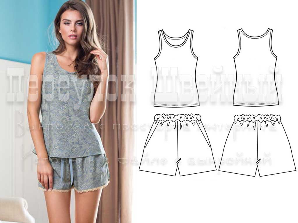 Выкройка женской пижамы с шортами для начинающих. Подойдет для пошива, как из трикотажных полотен, так и из неэластичных тканей. Это могут быть любая хлопкосодержащая ткань или же, наоборот, тонкий струящийся шелк или атлас.