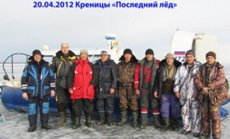 В СВП(Судно на Воздушной Подушке) умещается 10 пассажиров. Мы на сайте ПКР заранее укомплектовали свой экипаж и заранее подали заявку на Базу Креницы (город Новая Ладога в Волхвской губе на юге Ладожского озера). Рыбалка состоялась 20 апреля 2012 года. Погода уже несколько дней стояла плюсовая и ни какой другой транспорт больше не был способен доставить рыбаков на безопасный лёд. В СВП уютно как в автобусе. На лёд мы ехали мечтая о "бешеном клёве". На льду все как всегда разбежались кто-куда. Праздник!