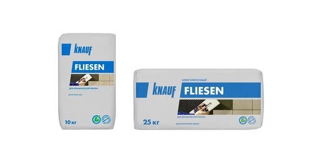 - «Кнауф Флизен Плюс». Knauf Fliesen Plus – еще один плиточный клей, имеющий улучшенные прочностные характеристики. Это достигается посредством добавления минеральных наполнителей и специальных полимеров. Средство имеет самый высокий уровень адгезии с бетоном, цементной стяжкой, гипсокартоном. Оно хорошо подходит даже для плиток с низким водопоглощением и разных видов камня, является морозостойким, применяется для отделки фасадов зданий и цоколей. Общая нагрузка на 1 кв. м. облицовки, выполненной с «Флизен Флекс», может составлять 50 кг.