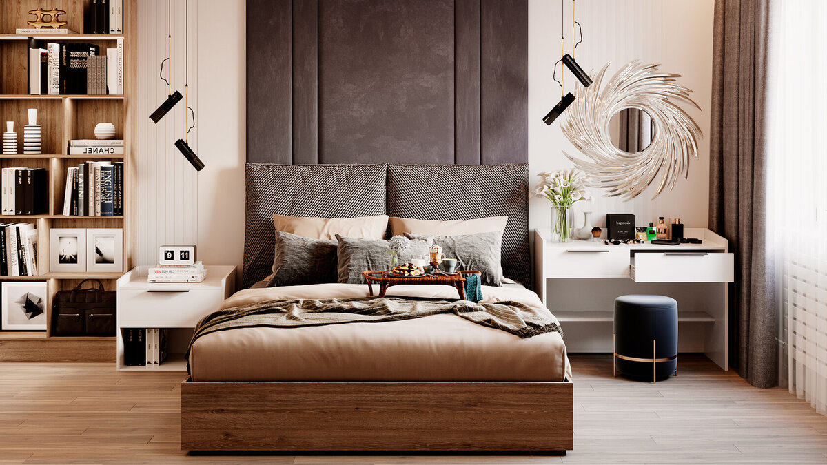 Также практично, чтобы в спальне было достаточно места для хранения вещей, например, в виде гардероба или хотя бы какого-нибудь функционального комода. В современной спальне также должна быть прикроватная тумбочка или стильное кресло для моментов отдыха.