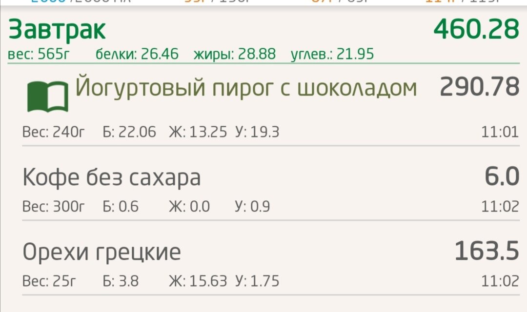 Всем привет! Когда там у нас следующие праздники? Майские? Или день космонавтики широко отмечать будем?)) в любом случае, пока серые, трудовые будни. Меня зовут Татьяна. Уменьшаюсь дома с большого веса, на сто килограмм. Программа такая - избавление по максимуму от пищевого мусора и подсчет калорий. Завтрак В холодильнике ещё оставался йогуртовый торт/пирог, так что после праздничный завтрак оказался прекрасен. Большая кружка кофе и большой кусок пирога. Вот почему перестала делать "молочное" желе, спрашивается? Одно время что только не взбивала с желатином - йогурты, ряженку, мягкий творог, да просто кефир. Летом особенно хорошо, когда и перекусить хочется и жарко. Обед Давно супа не было, вот теперь будет - рассольник. Очень густой, очень сытный. С перловкой. Надеюсь, есть его буду не только я, вроде всем по вкусу получился. Ужин Просто омлет, без бекона, без шампиньонов, "с таком"). Но это оказалась первая часть ужина. Потом еще за кадром кружка какао с орехами и протеиновыми п