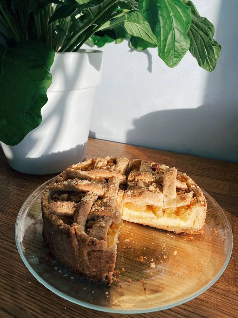 261 калория на 100 грамм ☺️ Ингредиенты: Тесто, муки, сливочного масла, яйцо, сахара, Первый слой начинки, творог (у меня 9% Росагро), яйцо, сахара (можно сахарную пудру с ванилью), муки, Второй слой начинки, Яблоко, Апельсин, сахар, крахмала Способ приготовления: Готовим песочное тесто. Просеиваем муку, добавляем яйцо, сахар, размягченное при комнатной температуре масло. Смешиваем все ингредиенты (можно руками или миксером с специальными венчиками для теста) Формируем тесто, обматываем пищевой пленкой и отправляем в холодильник на 30 минут. Подготавливаем первую начинку. Творог смешиваем с яйцом, добавляем муку и сахарную пудру. Вторая начинка. На сковороде растапливаем сливочное масло, выкладываем нарезанные яблоки и апельсин, тушим минут 5, затем добавляем крахмал, перемешиваем и остужаем. Раскатываем тесто. Укладываем его в форму, формируем бортики. Выкладываем первый слой начинки, затем второй слой начинки. Отправляем в разогретую до 185° духовку на 45 мин.