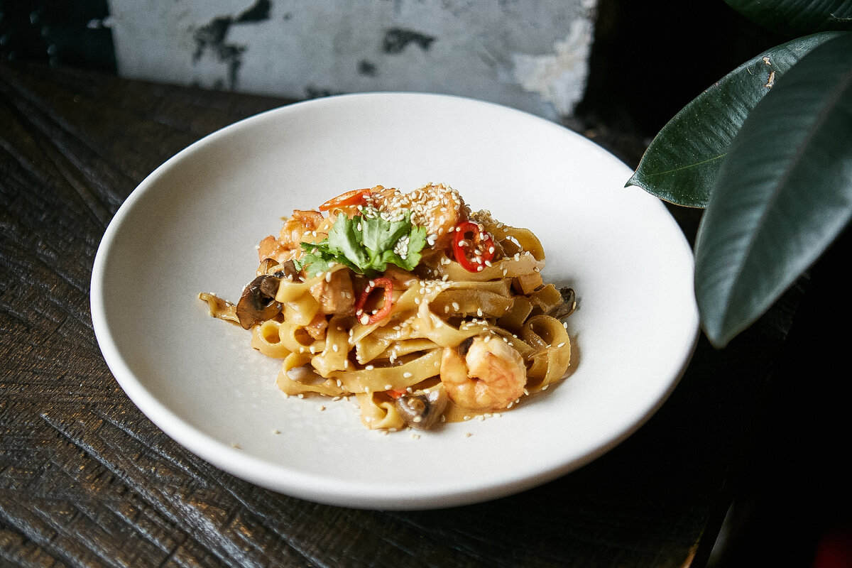 Рецепт от шеф-повара паста-бара Farro Технология приготовления соуса: Лук и чеснок порезать мелким кубиком, обжарить на растительном масле до полуготовности. Добавить перец чили, пасту Том Ям, обжарить и залить тёплым креветочным бульоном. Влить сливки и варить 10-15минут. Добавить все остальные ингредиенты (кроме сока лайма) и варить еще 5 минут, в конце добавить сок лайма и оставить настаиваться около часа. Приготовление пасты: Креветки и шампиньоны обжарить на растительном масле. Вскипятить воду в сотейнике, опустить пасту в воду и варить 40 секунд. Отварную пасту добавить в соус с ингредиентами и уварить на сильном огне около 2-х минут для загустения соуса. Выложить пасту на тарелку украсить листьями кинзы, слайсами чили и кунжутом.
