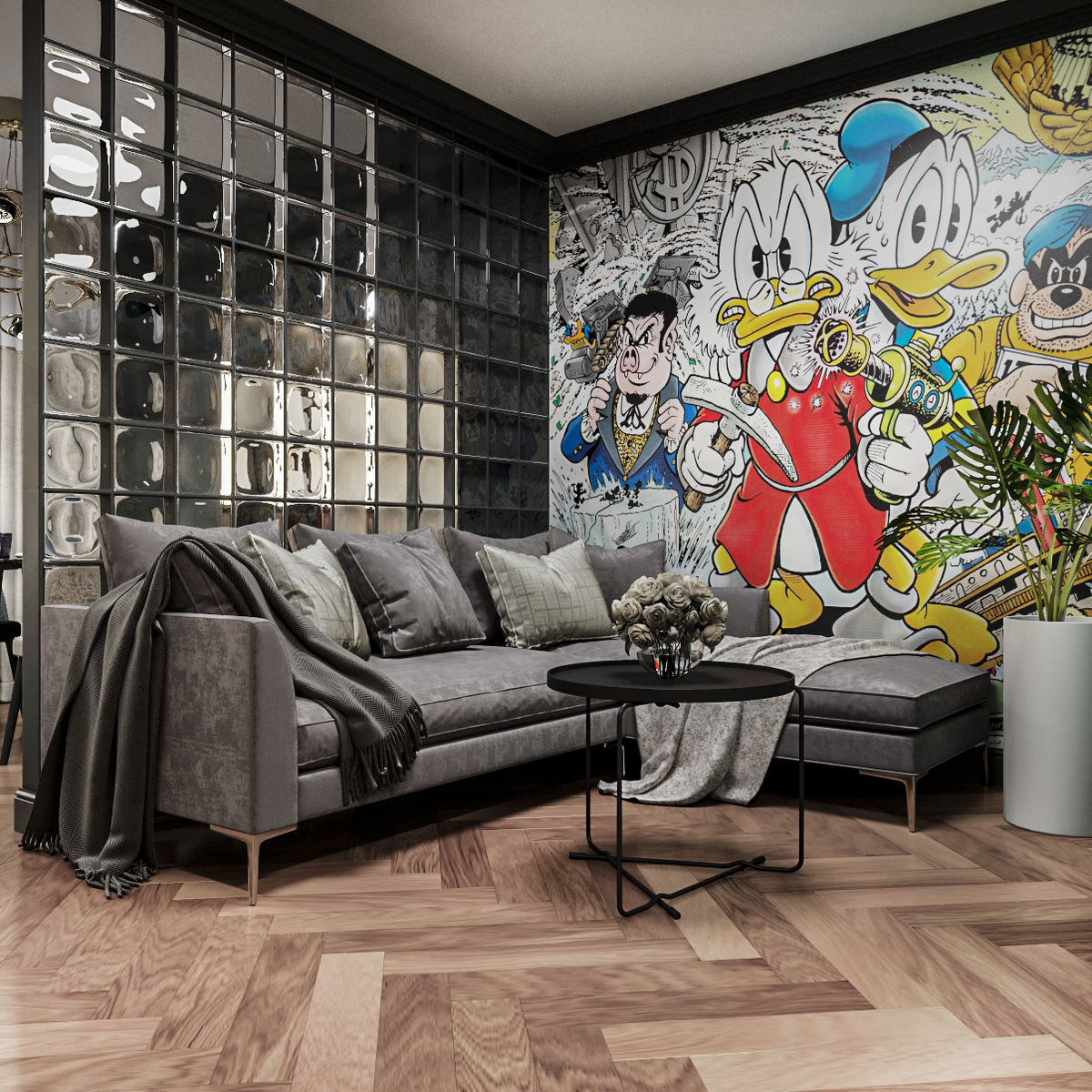 В гостиной было принято сделать зонирование обеденной зоны и зоны ТВ. Разделение сделали стеклоблоками, для того чтобы солнечный свет проникал с темные углы гостиной. На стене сделали фотопано в современно графике.