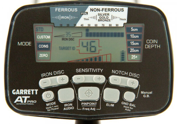 Металлоискатель Garrett AT PRO, не дешевый но и не самый дорогой детектор. Главные преимущества вашего нового прибора, большая катушка ДД, отстройка на грунт, широкая графическая шкала дискриминатора металлов, вывод числа Target ID (значение VDI) и еще можно с ним залезть в воду с головой. В остальном, обычный металлодетектор который может различать различные металлы.
