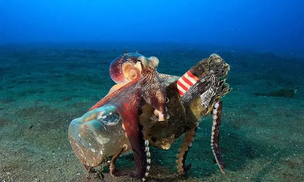 Осьминоги по своей природе очень изобретательны: они могут имитировать ядовитых существ, стрелять струей воды и даже научились выключать свет в аквариумах. Теперь анализ подводных изображений показал, что осьминоги все чаще используют выброшенные бутылки, банки и другие отходы в качестве убежища для себя или для своих яиц. В исследовании, впервые оценивающем и описывающем использование отходов осьминогами, были проанализированы сотни подводных фотографий, размещенных в социальных сетях и базах данных собранных морскими биологами и группами, интересующимися дайвингом. Исследование, опубликованное в журнале Marine Pollution Bulletin, зафиксировало 24 вида осьминогов, укрывающихся внутри стеклянных бутылок, банок и даже старых батарей. Они зарывались под смесью крышек от бутылок и ракушек и даже носили с собой пластиковые предметы, использовали банки как ходули на двух щупальцах, чтобы спрятаться от хищников. «Глубоководные записи чрезвычайно интересны, мы видим, что даже на больших глуби
