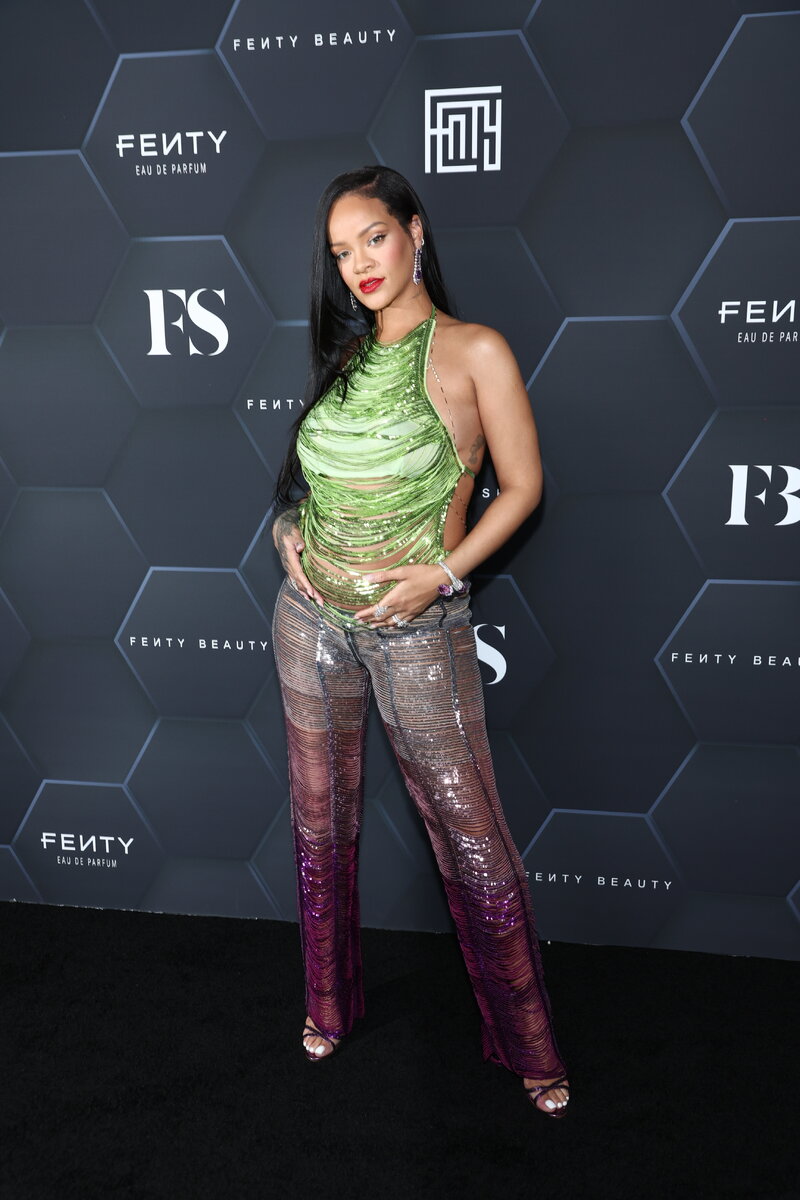 Первый совместный выход пары после объявления о беременности Беременность - не повод прятать изменившуюся фигуру под свободной одеждой. Такого принципа, похоже, придерживается Рианна, недавно объявившая, что скоро станет мамой - серией стрит-стайл снимков с округлившимся животом. С тем пор РиРи не только не скрывает своего интересного положения, но и активно его демонстрирует - каждый новый наряд 33-летней барбадосской певицы становится откровеннее предыдущего. Минувшим вечером Рианна появилась на вечеринке Fenty Beauty и Fenty Skin, которая прошла в студии Goya в Лос-Анжелесе. Для выхода певица выбрала мерцающий зеленый топ с открытой спиной, состоящий из сотни блестящих цепочек, и серебристо-фиолетовые брюки в таком же стиле. Ансамбль дополнили босоножки на тонких ремешках и высоком каблуке, массивные серьги с аметистами, множество колец и браслет с фиолетовым камнем. На фотоколле к Рианне присоединился отец ее будущего ребенка рэпер A$AP Rocky. Градус эпатажного образа возлюбленной